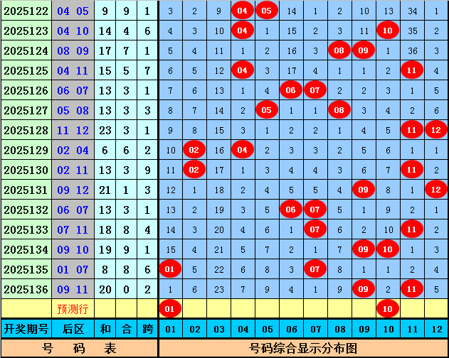 后区上期开出奖号09和11,该组合历史上出现了40次,其下期奖号频次分别为:号码12出现12次,05出现10次,10出现9次,07出现8次,04出现7次,09出现6次,01、02、06、11出现5次,03、08出现3次,本期后区参考号码01、02、03、10,精选两码01和10。