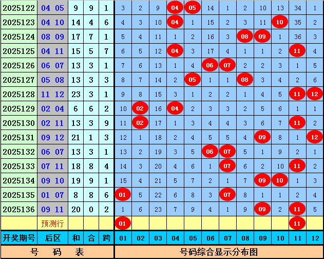 后区号码分析:在第137期历史同期开奖中奖,奖号05出现5次,奖号02 08出现4次,奖号01 06 07 09 11出现3次,奖号12出现2次,奖号04 10出现1次,奖号03没有出现。本期后区五码参考01、02、05、11、12。