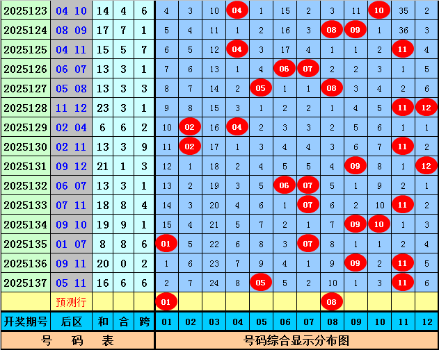 后区第二位分析分析:在第138期历史同期开奖中,该位号码升重降次数比为6:2:7,出现范围在04-12区间,最近5年后区第二位分析号码升重降次数比为2:0:3,出现范围在04-12,与最近几年同期号码相比,今年同期预计后区第二位分析号码再次下降,参考号码08。