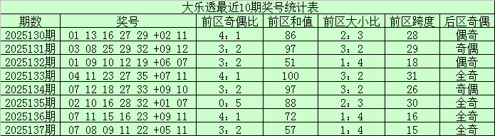 大乐透第25137期奖号为:07、08、09、11、22+05、11。其中前区和值为57,奇偶比为3:2,大小比为1:4。后区为一大一小、全奇组合。
