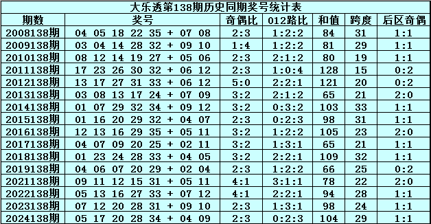 水镜体彩大乐透第2025138期历史同期奖号分析: