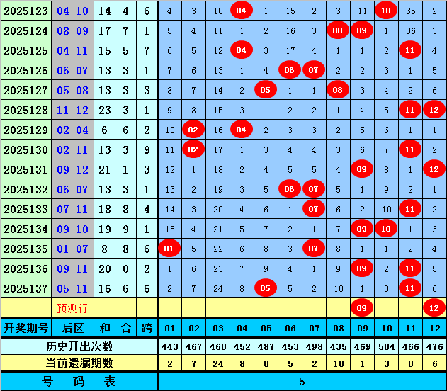 后区分析【一区01-04,二区05-08,三区09-12】:上期后区奖号为05和11,分别落在第二、三区,近50期后区三区比为30:35:35,近10期三区比为4:5:11,本期重防第三区号码大热,精选两码09+12。