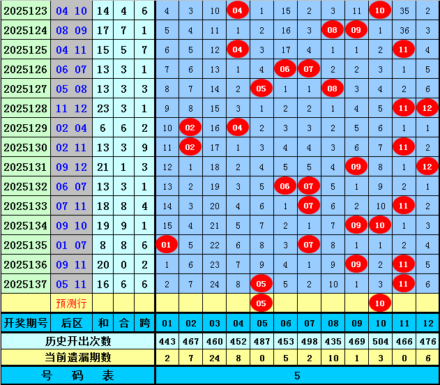 前区第二位:在历史第138期同期开奖中分布范围在04-23区段,平均值为12.1,奇偶比为10:6,去年同期开出奇数号码之后,今年第138期预计再出奇数号码,关注号码05。