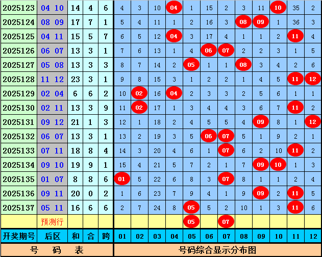 后区分析:上期后区奖号为05+11,开出一大一小组合,上周三后区奖号开出01+07,最近十周三后区奖号大小比为8:12,小 号表现比较活跃,本周三继续关注小 号出现,看好一大一小组合,参考两码05、07。