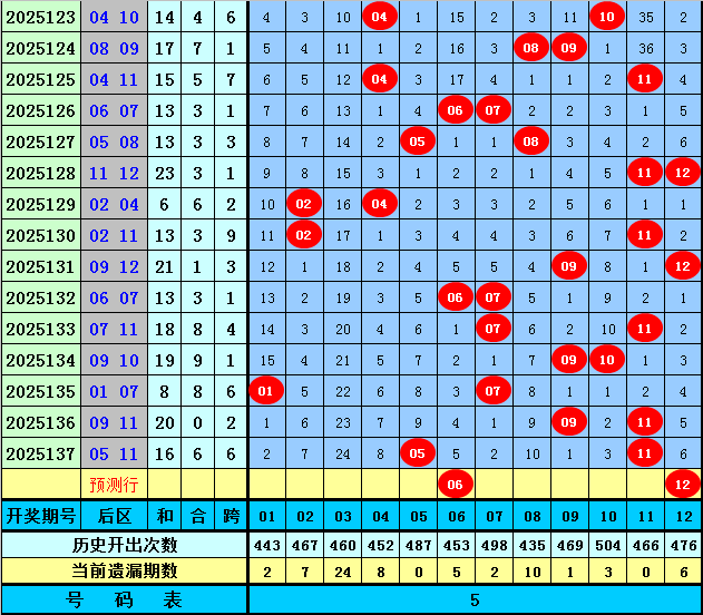 后区分析:上期后区开出一大一小组合:05+11,最近10期后区奖号大小比为14:6,本期防一大一小组合再出,参考两码06、12。
