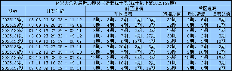 凡哥体彩大乐透第2025138期前区五区遗漏分析:(定义:遗漏0-3期号码为热码,遗漏4-9期号码为温码,遗漏10期及10期以上号码为冷码)