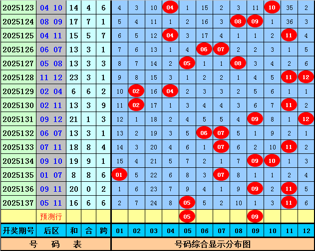 后区奖号分析:上期后区奖号为05+11,遗漏期数为9期和0期,目前后区号码01-12分别遗漏:2期、7期、24期、8期、0期、5期、2期、10期、1期、3期、0期、6期,本期后区注意号码02、05、09、10、12,两码关注05、09。