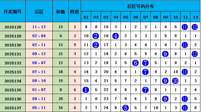 上期开出号码05、11,奇奇组合,近10期总奇偶总比13:7,奇数球开出次数多,本期后区推荐偶偶组合:02、12。