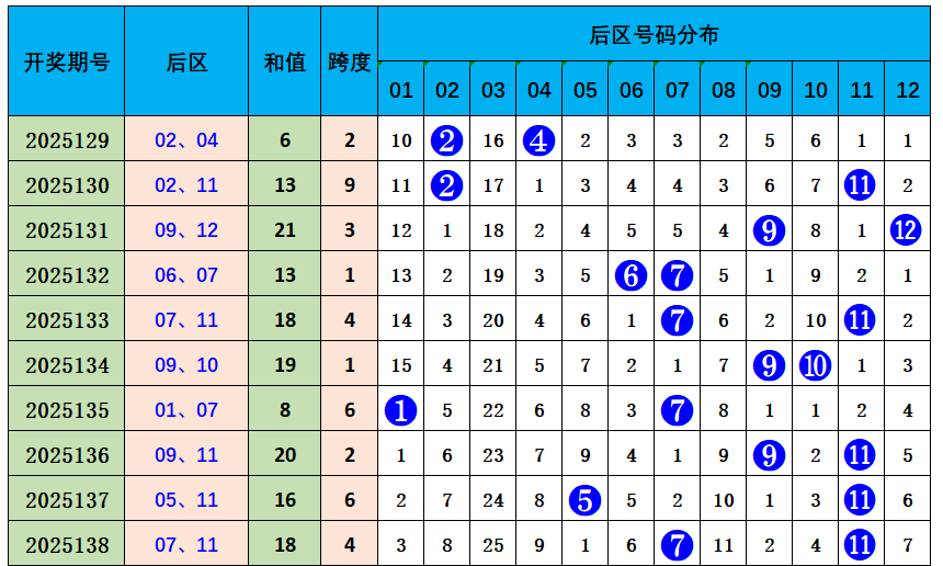 上期后区开出奖号07、11,奇偶比2:0,近10期奇偶比14:6,奇数奖号开出较多,本期推荐奇偶比2:0,参考后区号码03、05。