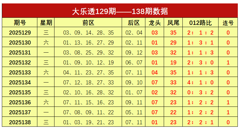 大乐透第2025138期出奖号统计:前区01、03、19、21、23,后区07、11。龙头01,凤尾23,012路比为2:2:1,未开出连号。