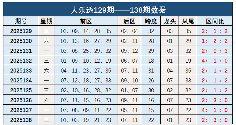大乐透第2025138期出奖号统计:前区01、03、19、21、23,后区07、11。前区跨度22,龙头01,凤尾23,区间比比2:3:0。