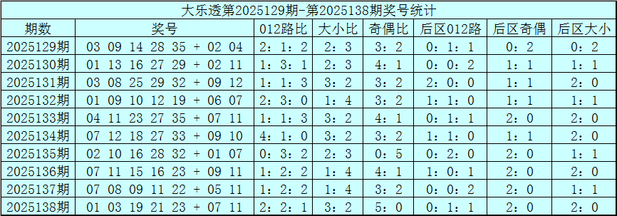 体彩大乐透第25138期奖号为:01 03 19 21 23+07 11,前区奖号012路比为2:2:1,奇偶比为5:0,大小比为3:2,后区0路号码轮空。