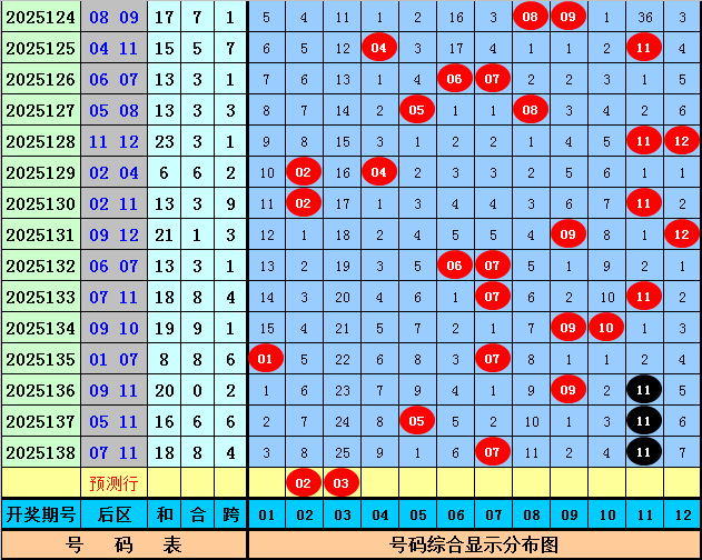 后区分析(一区01-04,二区05-08,三区09-12):上期后区开出奖号07和11,最近10期后区三区落号比为4:9:10,本期后区关注号码02、03、06、08、09,后区两码参考02、03。