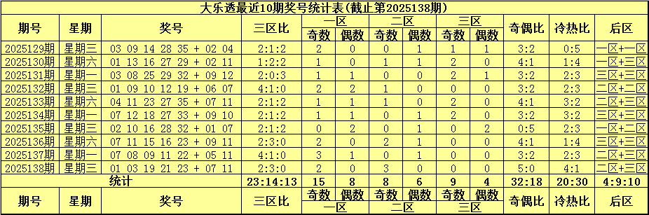 前区三区走势:上期前区奖号三区比为2:3:0,最近10期前区奖号三区比为23:14:13。