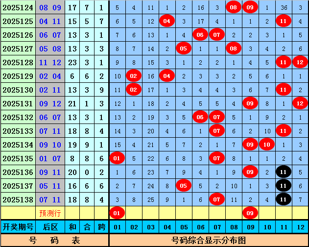 后区上期开出奖号07和11,该组合历史上出现了48次,其下期奖号频次分别为:号码05、10出现11次,02、09出现9次,06、11、12出现8次,07出现7次,03、04、08出现6次,01出现5次,本期后区参考号码01、08、09、10,精选两码01和09。