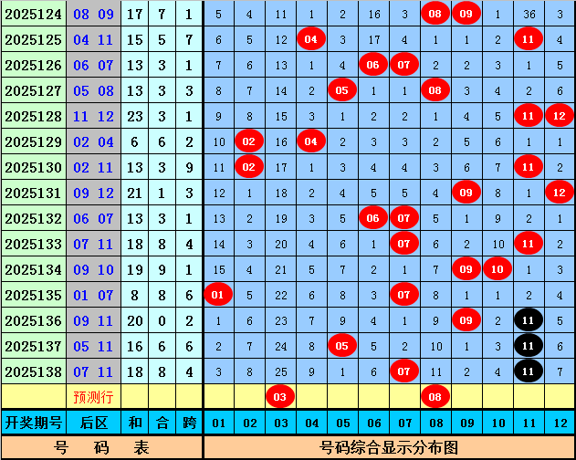 后区推荐:第139期历史同期后区奇偶比总比例为19:13,偶数表现较冷,本期防止回补,关注一奇一偶组合开出,看好两码03、08。