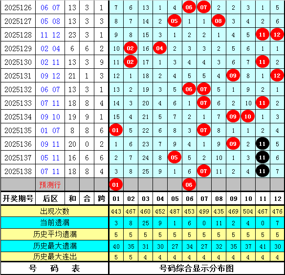 石浩第2025139期大乐透后区分析:后区上周星期六后区奖号为09和11,上期开出奖号07和11,最近9周星期六与最近9期后区奖号大小比分别为11:7和14:4,奇偶比分别为11:7和14:4,本期预计后区开出全小组合。注意号码01、02、03、06。