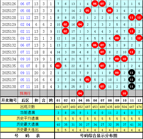 其中,后区奇偶比为17:23,大小比为20:20,012路比为9:17:14,本期后区金胆参考04。