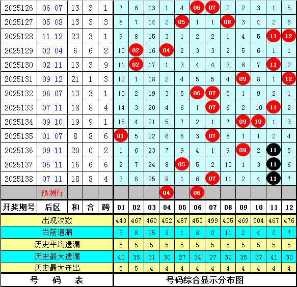 后区判断:上期后区奖号为07和11,开出热码+热码组合。最近十期后区开出13个热码、5个温码和2个冷码,本期预计奖号关注温码+温码组合,参考两码04、06。