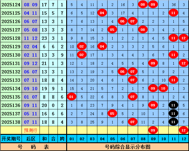 后区分析:上期后区开出号码07和11,在最近15期开奖中,后区奖号奇偶比为19:11,大小比为21:9,本期后区关注一奇一偶组合和全大组合,精选两码09和12。