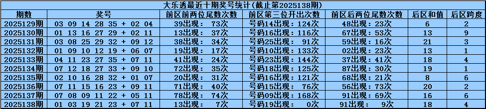 体彩大乐透第2025138期奖号为:01 03 19 21 23+07 11,前区号码大小比开出3:2,012路比开出2:2:1,奇偶比开出5:0,后区号码和值开出18,跨度开出4。
