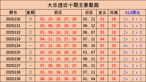 大乐透上期开奖号前区为:08 18 22 30 35,后区01 04;012路比2:1:2,龙头开出08,凤尾开出35