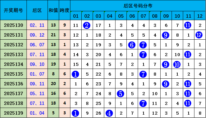 后区分析:上期后区开出01 04,跨度3,近十期跨度是:9、3、1、4、1、6、2、6、4、3,波动范围较大,跨度范围在1-9之间,本期预计跨度值下降,重点关注号码09 11,跨度2。