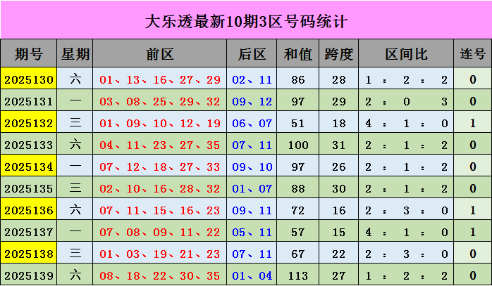 三区(25-35):上期奖号30、35,近10期出号较温,出号13枚,从走势上看,出现四次断区,本期推荐:31