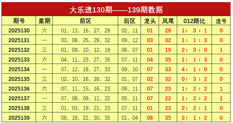 大乐透第2025139期出奖号统计:前区08、18、22、30、35,后区01、04。龙头08,凤尾35,012路比为2:1:2,未开出连号。