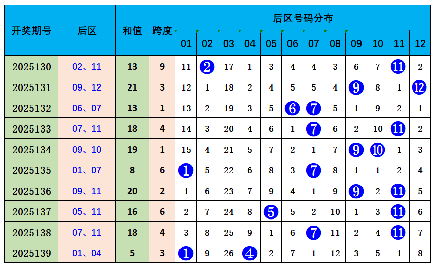 二区(13-24):上期开出2个号码,最近10期该区开出15个号码,出号较温,本期预计会开出3个奖号,推荐奖号13、20、22。