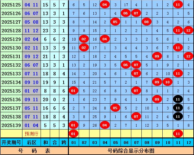 后区分析:在第140期历史同期开奖中,和值大小为8:8,跨度奇偶比为12:4,本期后区注意两码01和11。