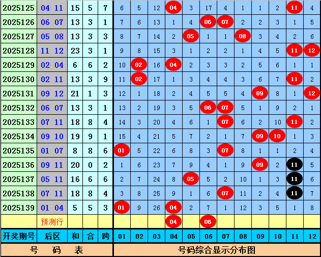 后区分析:上期后区开出全1路号码01和04,最近30期后区奖号012路比为14:21:25,最近10期后区奖号012路比为5:8:7,本期后区注意号码04、06、08、10、12,单挑两码组合04、06。