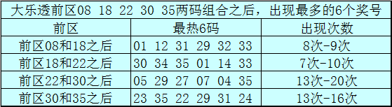 前区两码08和18和之后表现最热的6个号码为:01、12、31、29、32、33;