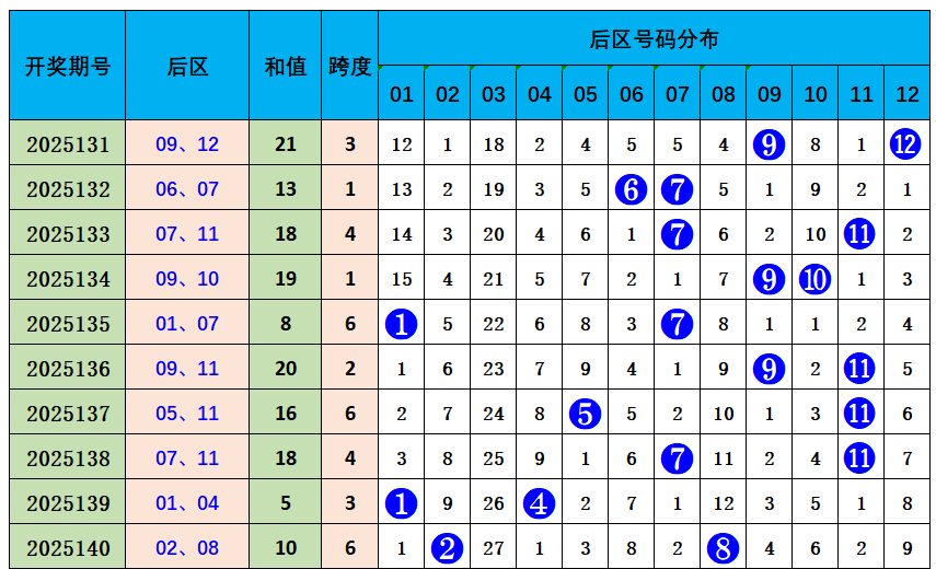 上期后区开出奖号02、08,奇偶比0:2,近10期奇偶比14:6,奇数奖号开出较多,本期推荐奇偶比0:2,参考后区号码10、12。