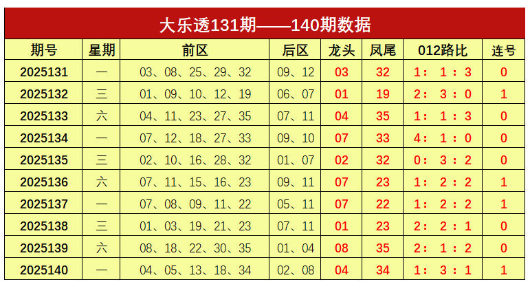 大乐透第2025140期出奖号统计:前区04、05、13、18、34,后区02、08。龙头04,凤尾34,012路比为1:3:1,开出1组连号。