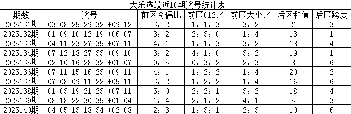 012路分析:上期前区奖号012路比为1:3:1,最近两周1路前区奖号走势较热,0路前区奖号表现较冷。
