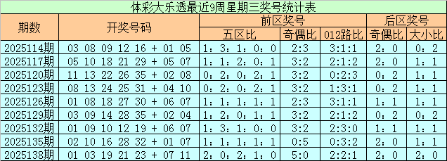 上期回顾:体彩大乐透上周星期三(第2025138期)奖号为01 03 19 21 23 + 07 11,前区奖号五区比为2:0:2:1:0,奇偶比为5:0,012路比为2:2:1,后区奖号奇偶比为2:0,大小比为2:0。