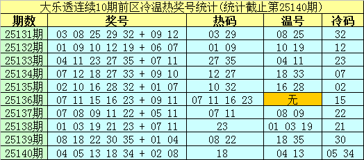 大乐透第25131期-第25140期前区奖号冷温热分布统计: