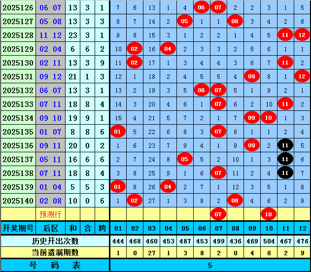 后区分析【一区01-04,二区05-08,三区09-12】:上期后区奖号为02和08,分别落在第一、二区,近50期后区三区比为30:36:34,近10期三区比为4:7:9,本期注意第二、三区号码出现,关注两码07+10。