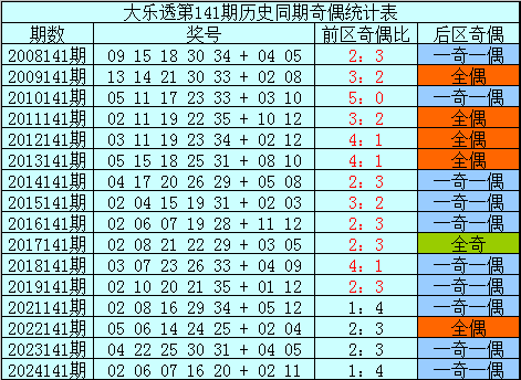 后区分析:在第141期历史同期开奖中,后区奖号奇偶比为12:20,最近5年同期后区奇偶走势为:一奇一偶、一奇一偶、全偶、一奇一偶、一奇一偶,今年同期看好偶数号码大热,关注号码02、12。