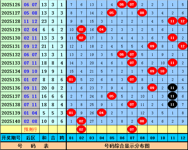 后区分析:上期该位开出奖号02和08,和值为10,跨度为6,后区前4次开出和值10和跨度6时,其下期奖号分别为:06+12、10+12、02+12、07+12,号码奇偶比为1:7,大小比为6:2,012路比为5:2:1,本期后区号码参考01、02、05、07、12,精选两码02、07。