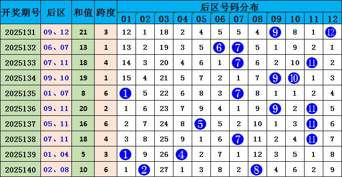 后区分析:上期开出小大偶偶组合02、08,前十期后区大小比为15:5,大数号码相对热出,其中小大组合占4期。本期预计小大组合出现,后区推荐号码02、07。