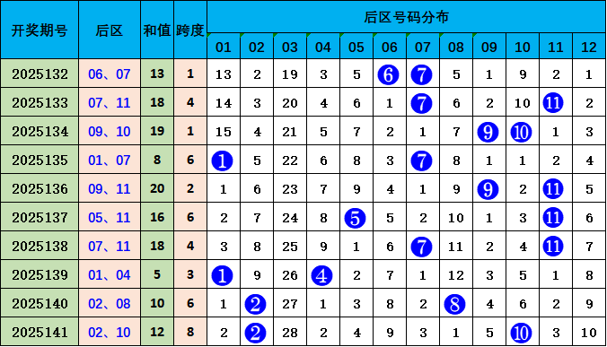 后区分析:上期后区开出02 10,开出和值12,和值范围在5-20之间,波动范围较大,本期预测和值下降趋势,重点关注号码02 05,和值7。
