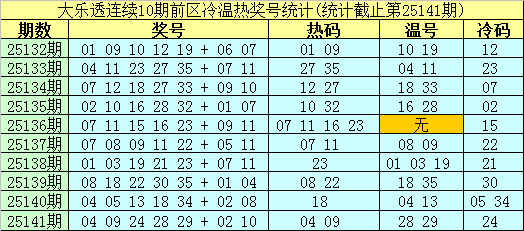 大乐透第25132期-第25141期前区奖号冷温热分布统计: