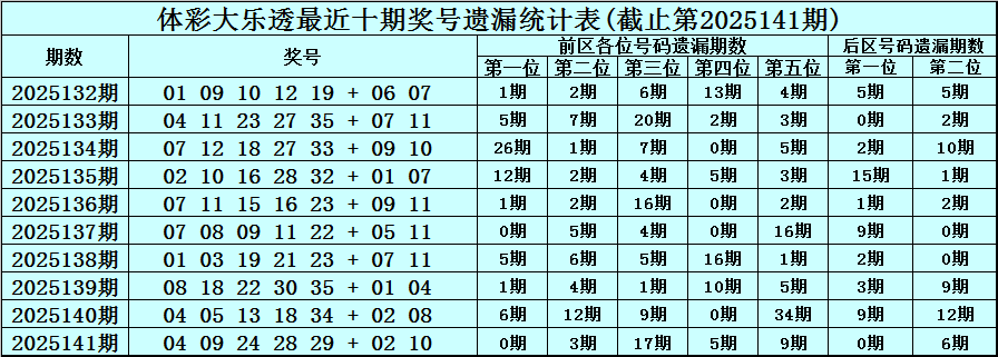 第2025141期奖号:04 09 24 28 29 + 02 10 ,各位号码遗漏期数为:0期、3期、17期、5期、9期 + 0期、6期。