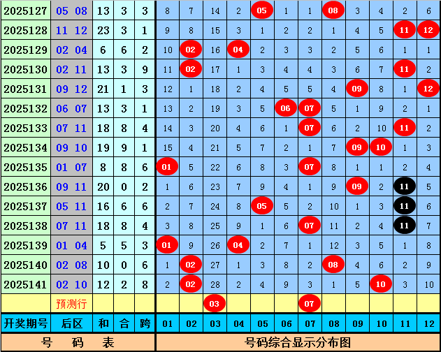 后区分析:后区上期开出号码02和10,分别遗漏0期和6期,目前后区01-12区间冷温热号码个数比为1:4:7,本期后区注意号码03+07。