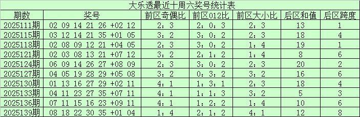 前区奇偶走势:上期前区奇偶比为2:3,上周六前区奇偶比1:4,最近十周六奇数号码表现占优,本期看好奇数号码继续走热,推荐奇偶比3:2。