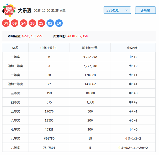大乐透第2025141期开出奖号:前区04、09、24、28、29,后区02、10。当期前区012路比为2:2:1,奇偶比为2:3,和值为94,跨度为25,后区奖号出现在一、三区。