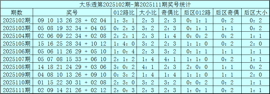 体彩大乐透第25111期奖号为:02 09 14 21 26+02 12,前区奖号012路比为2:0:3,奇偶比为2:3,大小比为2:3,后区1路号码轮空。