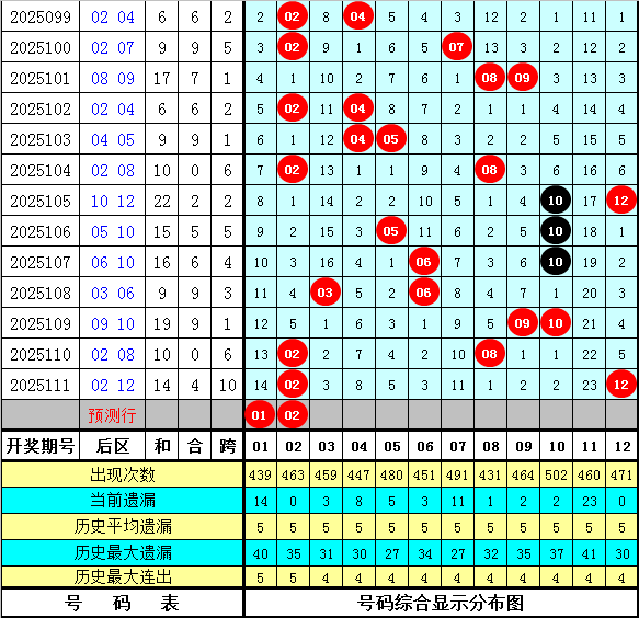 后区分析:在第112期历史同期开奖中,后区奖号全偶组合开出6次,一奇一偶组合开出10次,全奇组合开出1次,本期后区预计出现一奇一偶组合,看好号码01、02、06、10。